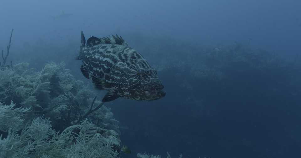 Gros Mérou nage, caméra le suit puis fait demi tour travelling arrière++++