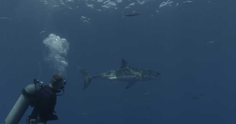 Requin blanc passe dans des Maquereaux puis près d’un plongeur