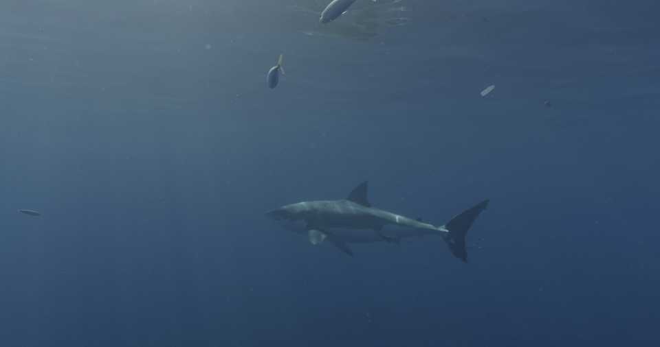 Requin blanc passe dans des Maquereaux puis près d’un plongeur